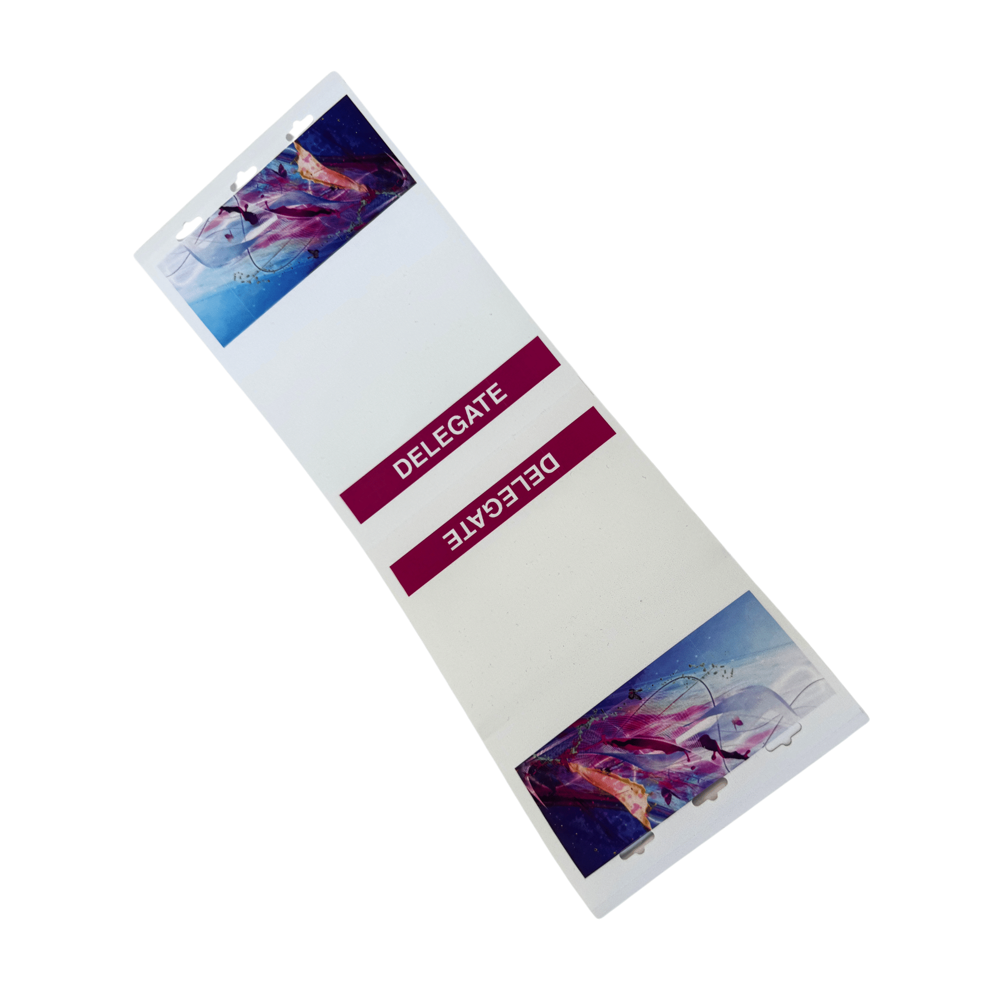 Synthetic Paper stock suitable for ONSITE demand printing of Conference/Event nametags. A6 BUTTERFLY (top to tail size 105mm x 296) finished size is approximately 105mm x 148mm with triple elbow slots. We supply these inserts printed on TWO panels.
