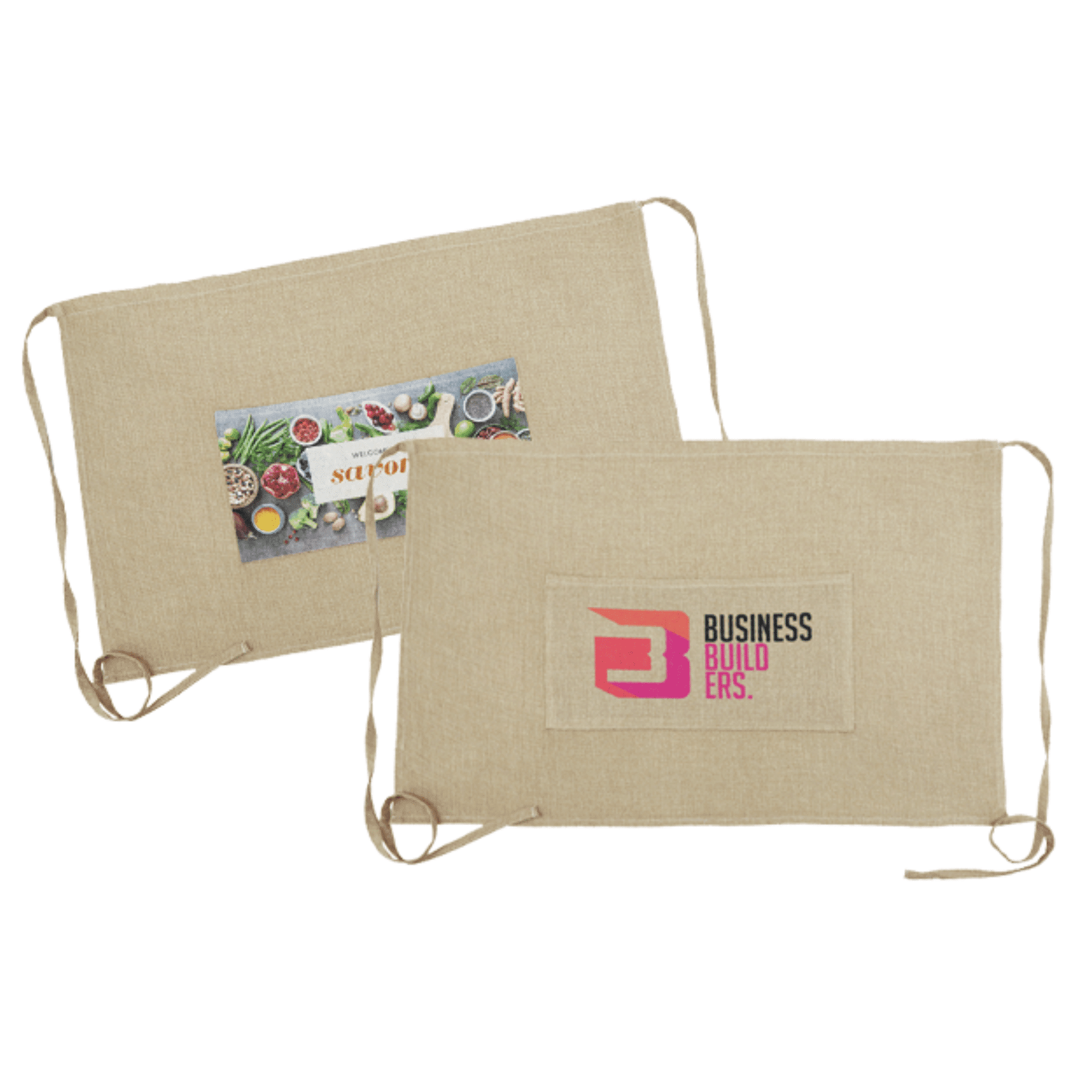 Locally printed full colour on the pocket Faux Burlap Waiters Apron. Great for sending an eco-look message as this apron has the look of Burlap. Vibrant print and great branding area.