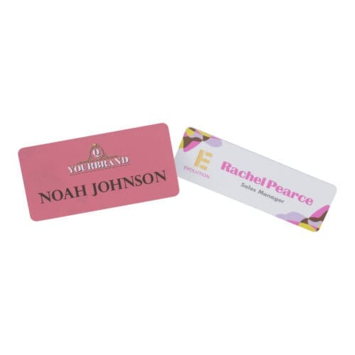 Matt finish PET plastic staff name tag. Base colour is white and various attachments. Available in two sizes.