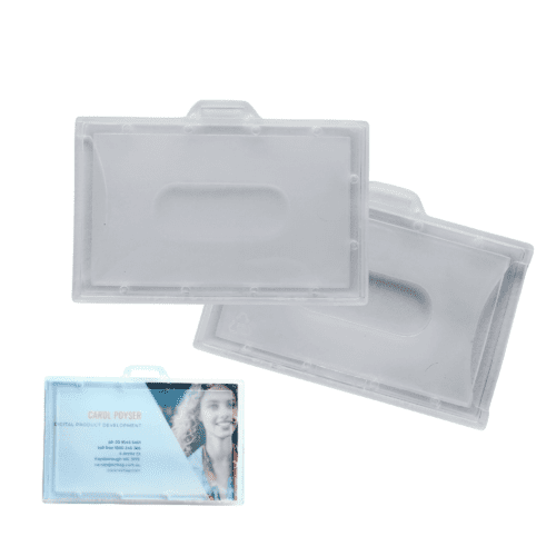 Rigid Frosted Finish ID Card Holder Landscape – Suitable for Plastic ID cards. Loop slot on top makes it easier for vinyl straps to attached.