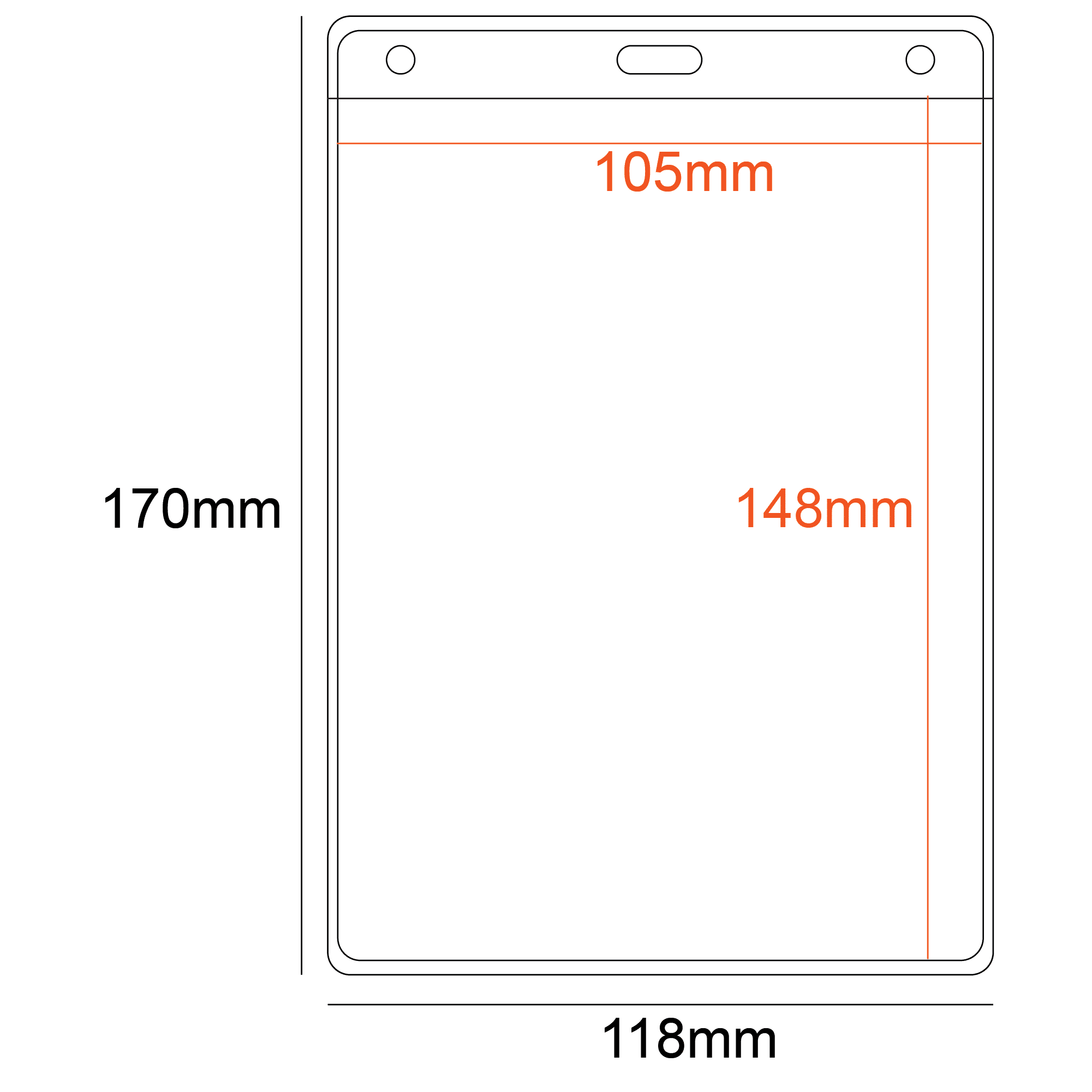 A large single compartment vertical name card holder which is A6 size (one quarter the size of an A4 page) A flexible soft clear gloss PVC holder with holes and a slot for lanyard attachment.