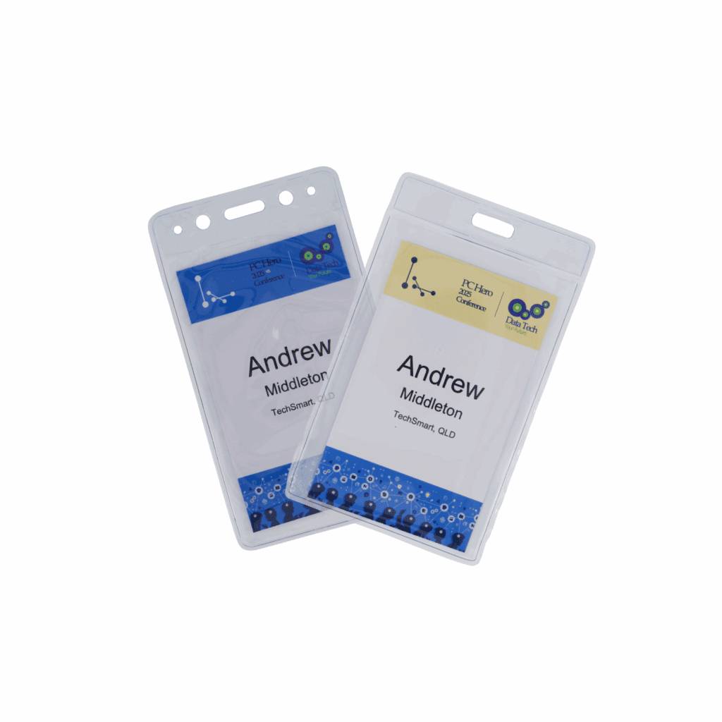 A heavy duty PVC pocket that has a single compartment that fits our name card inserts up to 55mm wide x 90mm high with a single slot.