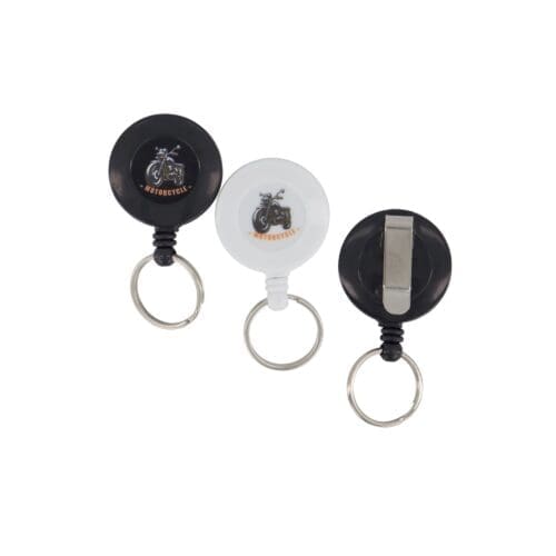 Standard round retractable reel with Keyring and Belt Clip. External chrome/plastic body and stainless steel internal springs.