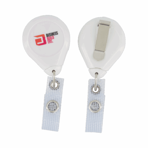 Standard tear drop retractable reel with Vinyl Strap and Belt Clip. External chrome/plastic body and stainless steel internal springs.