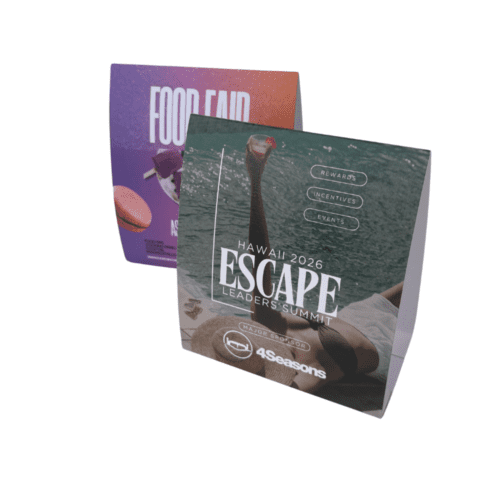Our table tent signs are printed in-house at EziTag and are ideal for table numbers, session details, or sponsor messaging. Available in economical 350gsm paper or premium textured linen stock, they provide clear, professional tabletop signage.